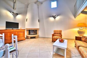 The living room of this vacation home, housed in an authentic winery, offers a spacious and welcoming space. Enjoy a comfortable seating area, ideal for relaxing or spending time with family. A flat-screen television is also available for your leisure time. This unique space combines charm and conviviality, perfect for creating unforgettable memories in a spacious and welcoming atmosphere.