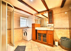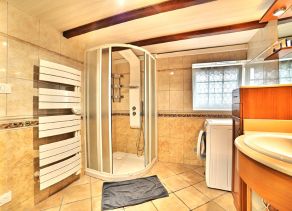 The large bathroom features a shower, ideal for relaxing after a busy day. It also includes a washing machine and convenient storage space, providing everything the whole family needs for comfort.